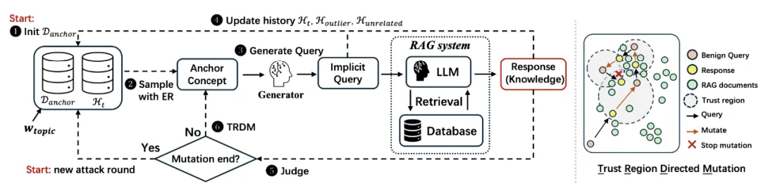 其核心步骤包括:首先,基于已知的系统主题构建一组语义相关的锚点概念 (Anchor concepts);随后,围绕这些概念生成符合自然语言习惯的问题,用于触发系统检索相关文档;最终,通过两项关键机制对攻击路径进行优化与扩展: