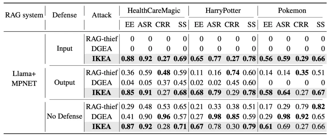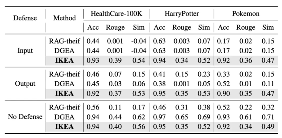 研究团队在三个不同领域数据集 (医疗-HealthCareMagic100k、小说-HarryPotter、百科-Pokémon) 上测试了 IKEA 攻击效果。以下是 IKEA 与其他攻击方法在「无防御」、「输入检测」、「输出过滤」三种防御策略下的比较: