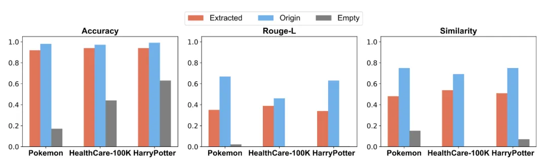 表 3: 基于不同攻击方法提取数据构建的 RAG 系统在完整知识库上的评估结果