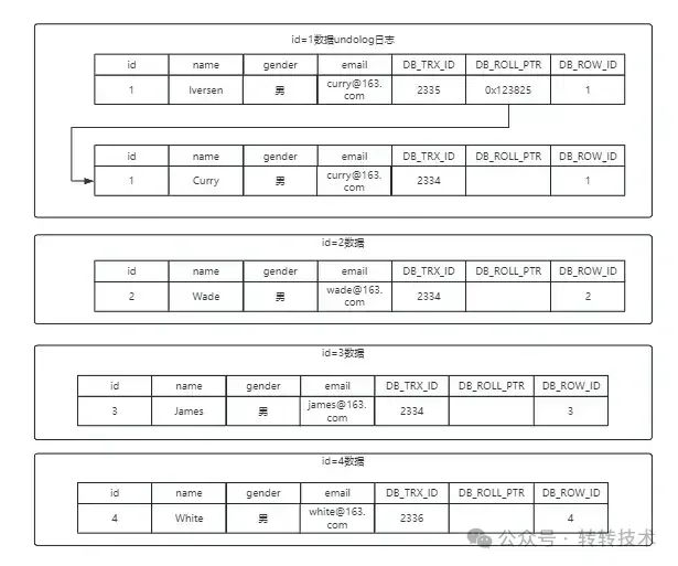 复制+----+-------+--------+----------------+-----------+-----------+---------+ | id | name | gender | email | DB_TRX_ID |DB_ROLL_PTR|DB_ROW_ID| +----+-------+--------+----------------+-----------+-----------+---------+ | 1 | Curry | 男 |curry@gmail.com | 2335 | 0x123825 | 1 | | 2 | Wade | 男 |wade@gmail.com | 2335 | 0x153125 | 2 | | 3 | James | 男 |james@gmail.com | 2335 | 0x115725 | 3 | | 4 | White | 男 |white@gmail.com | 2335 | 0x163225 | 4 | +----+-------+--------+----------------+-----------+-----------+---------+1.2.3.4.5.6.7.8.undolog情况如下: