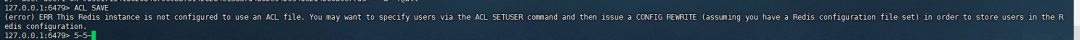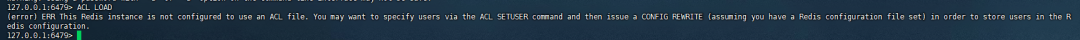 复制127.0.0.1:6479> ACL LOAD (error) ERR This Redis instance is not configured to use an ACL file. You may want to specify users via the ACL SETUSER command and then issue a CONFIG REWRITE (assuming you have a Redis configuration file set) in order to store users in the Redis configuration.1.2.