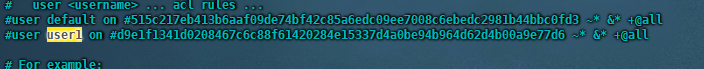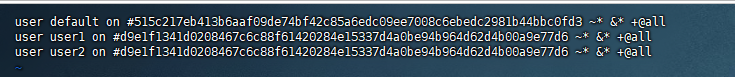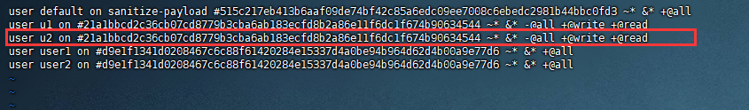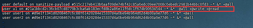 复制127.0.0.1:6479> ACL LOAD OK 127.0.0.1:6479> ACL LIST 1) "user default on sanitize-payload #515c217eb413b6aaf09de74bf42c85a6edc09ee7008c6ebedc2981b44bbc0fd3 ~* &* +@all" 2) "user u1 on #21a1bbcd2c36cb07cd8779b3cba6ab183ecfd8b2a86e11f6dc1f674b90634544 ~* &* -@all +@write +@read" 3) "user u2 on #21a1bbcd2c36cb07cd8779b3cba6ab183ecfd8b2a86e11f6dc1f674b90634544 ~* &* -@all +@write +@read" 4) "user user1 on #d9e1f1341d0208467c6c88f61420284e15337d4a0be94b964d62d4b00a9e77d6 ~* &* +@all" 5) "user user2 on #d9e1f1341d0208467c6c88f61420284e15337d4a0be94b964d62d4b00a9e77d6 ~* &* +@all"1.2.3.4.5.6.7.8.