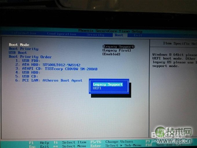 第一是“Boot”项目中的“BootMode”系统默认设置是“UEFI”要将其改为“Legacy Support”;