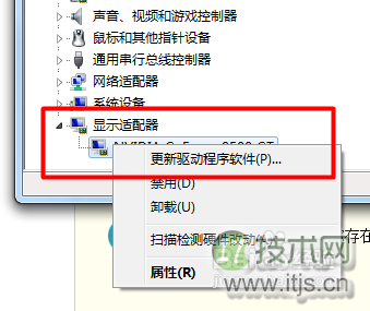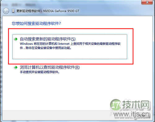 4、然后选择“自动搜索更新的驱动程序软件”进行搜索,假如Windows 7 的驱动库中有,IT技术网就会自动下载并安装。