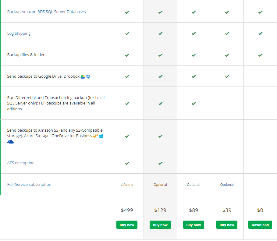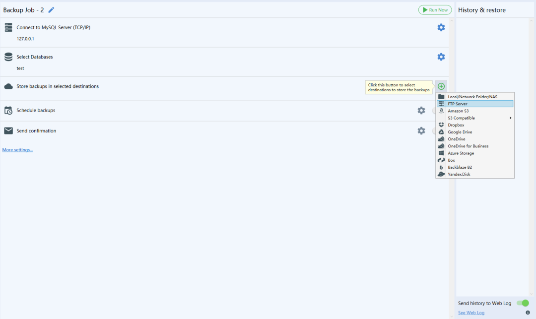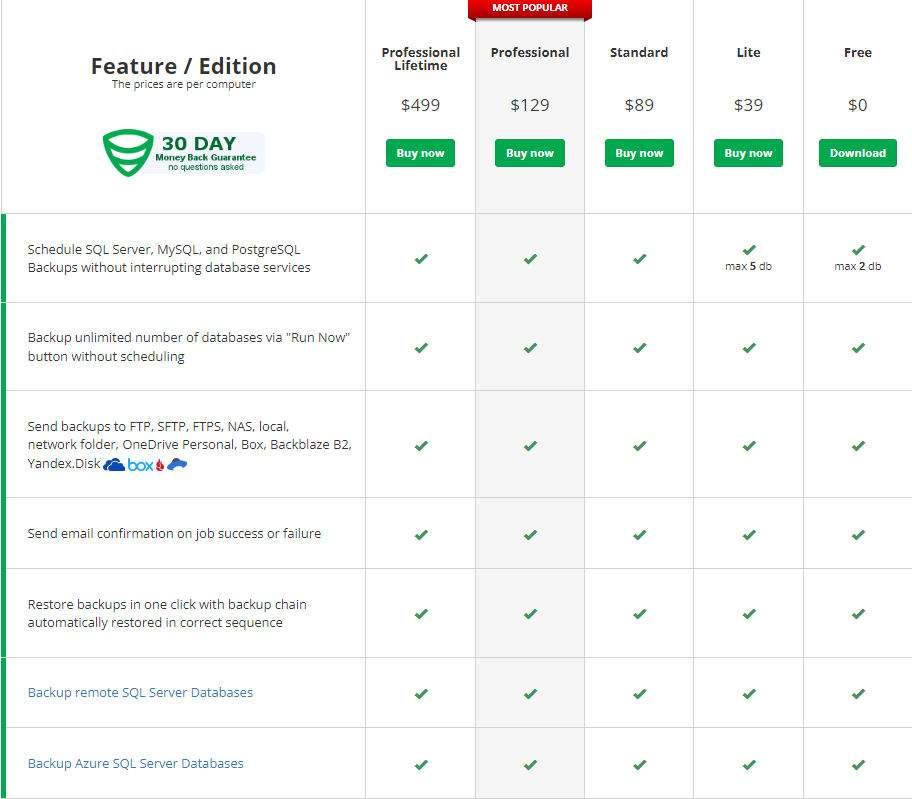 SQLBackupAndFTP是理想的任何SQL Server, MySQL, PostgreSQL, Azure SQL,或亚马逊RDS SQL数据库,产生的备份可以存储到FTP, SFTP, FTPS, NAS,本地或网络文件夹,谷歌驱动器,Dropbox, OneDrive, Box,亚马逊S3(和任何S3兼容的存储),Azure存储,香港云服务器Backblaze B2, Yandex.Disk。它对任何SQL Server版本都特别有用,包括Azure SQL和Amazon RDS SQL、MySQL、MariaDB或PostgreSQL,因为这些数据库没有内置的备份工具。