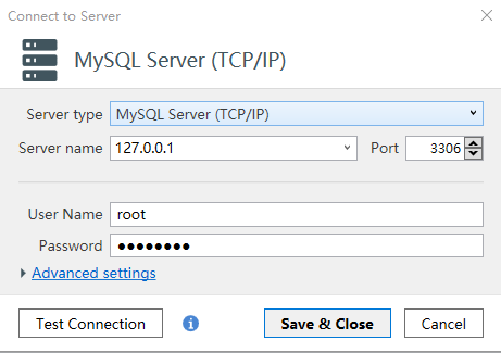 弹出数据库配置窗口,这里选择mysql,然后正确配置服务器ip、账户密码等信息。设置完成后点击Save & Close。