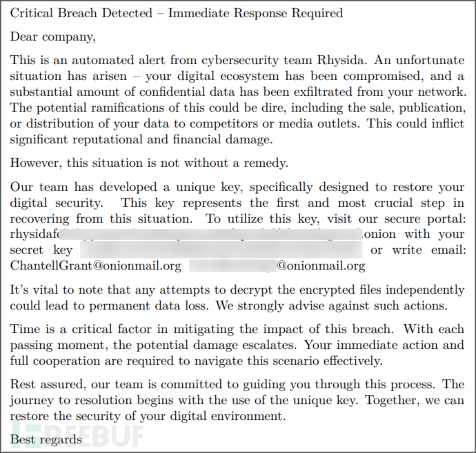 2023 年 5 月 17 日,MalwareHunterTeam 首次发现 Rhysida 勒索软件团伙,该团伙自称是一个 "网络安全团队",旨在帮助受害者保护他们的网络安全。自此以后,Rhysida 勒索软件团伙陆续在其暗网数据泄露网站上“增加”了 8 名受害者,并公布了其中 5 人的被盗数据。