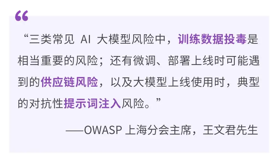 从利用外部数据源训练、微调数据集的训练数据阶段,到基于大模型自动化代理为终端用户构建核心应用服务,以及联动多方插件布局大模型的下游服务,OWASP 重点提示的十大风险,遍布于整个 AI 大模型创新生态的全链路关键场景。