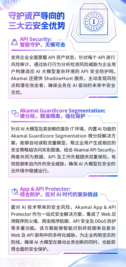 当下,多数 AI 大模型都部署于云端,所在云环境的安全性也十分关键。作为拥有多年安全基础设施经验积累的云服务商,Akamai 针对智能化时代的数据安全威胁,已构建有一套完全闭环的保护体系。目前,Akamai 通过多种路径与具备 AI 能力的云安全产品,深度保护 AI 大模型、API 与数据等企业核心资产。