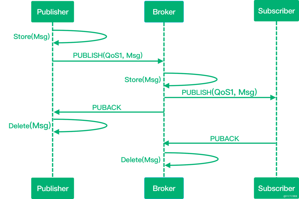 消息传递至少 1 次。包含了简单的重发机制,Sender 发送消息之后等待接收者的 ACK,如果没收到 ACK 则重新发送消息。这种模式能保证消息至少能到达一次,但无法保证消息重复。