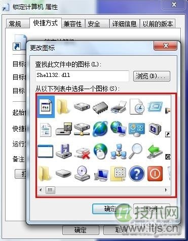 6、在弹出的”更改图标“里的”查找此文件中的图标“框内,输入Shell32.dll,鼠标左键点击“确定”,如图