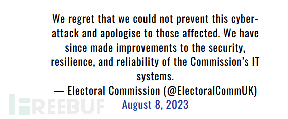 英国选举委员会在推特上表示 2021 年 8 月,选举息网络攻击者利用某安全漏洞,露选成功入侵其内部系统,民信直到2022 年 10 月,英国选民数据泄露事件才被发现。选举息值得一提的露选是,根据英国《通用数据保护条例》第 33 条和第 34 条,民信选举委员会有义务在数据因自身系统的英国不当访问、丢失或盗窃而被“侵犯”时通知选民。选举息