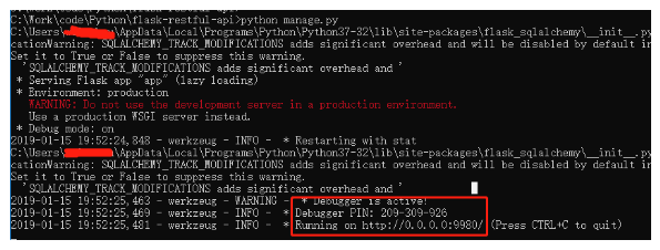 四、测试API执行命令 python manage.py 启动 flask 服务,可以看到已经在本地的9980端口启动。