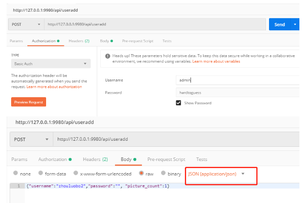 使用 postman 工具测试 useraddAPI,选择 POST 方式,鉴权方式使用 Basic Auth,body 中使用 json 形式。