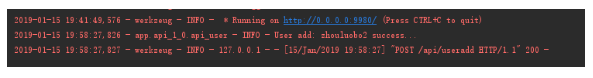 复制api_user = Api(api_1_0)class UserAddApi(Resource): @auth.login_required def post(self): user_info = request.get_json() try: u = User(username=user_info[username]) p = Picture(picture_name=user_info[username]) u.password = user_info[password] u.picture_count = user_info[picture_count] db.session.add(u) db.session.add(p) db.session.commit() except: logger.info("User add: {} failure...".format(user_info[username])) db.session.rollback() return False else: logger.info("User add: {} success...".format(user_info[username])) return True finally: db.session.close()api_user.add_resource(UserAddApi, /useradd, endpoint=useradd)1.2.3.4.5.6.7.8.9.10.11.12.13.14.15.16.17.18.19.20.21.22.23.24.25.这里只接受 json 的请求消息体,并且对应的更新数据库中表的值。