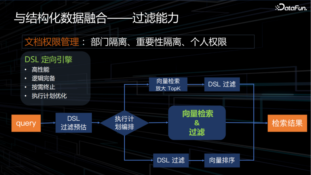 抖音集团实践:为解决这一问题,技术团队研发了DSL定向引擎,支持在检索过程中同时进行向量检索和DSL过滤(结构化过滤)。该引擎具有以下特点: