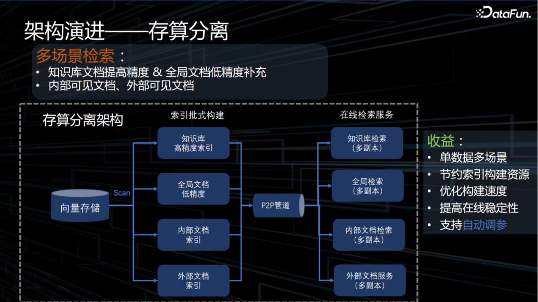 向量存储。用户将他们的向量存储在向量存储中。批式构建。批式构建集群自动调度向量索引的构建流程。在此过程中,会筛选候选集,根据不同的精度要求适配不同的参数,构建相应的索引,然后通过P2P管道分发给在线的多副本检索服务。在线检索服务。负责实时在线检索。这种设计除了解决一份向量多个索引、支持多个场景的问题,还带来以下优势: