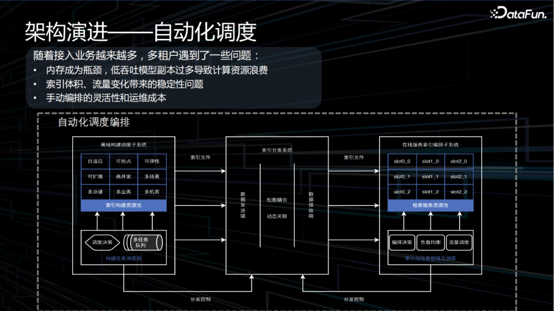 对在线检索服务编排的改造,主要采用slot化的方式。一个slot是索引的一个最小调度单元。通过索引元信息管理调度服务会根据在线检索服务配额和实时调用流量,自动调入调出slot。