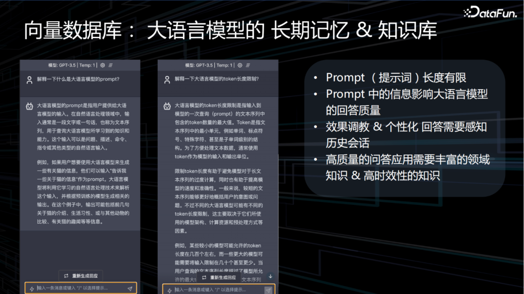 在大语言模型中,prompt是给大语言模型的输入。prompt的信息含量会影响最终回答的质量。然而,由于算法原理和计算能力的限制,prompt的长度是有限制的。无论是多轮调校,还是个性化问答的感知,还是特定领域的知识灌入,都需要更长的prompt。其次,由于训练样本的限制,大语言模型的时效性存在缺陷,只能知道训练数据截止时输入的信息,对于需要时效性回答的场景需要支持手段。对于这个问题,向量数据库可以在一定程度上解决。