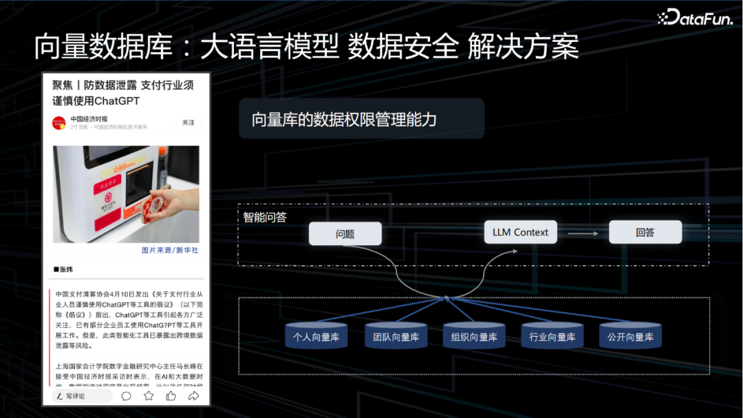 但是,另一类问题从大语言模型的机制上就难以解决。大语言模型中包含的信息越多,回答质量就越好。理论上,我们在训练大语言模型的时候,或者优化它的时候,希望它具有全局所有的信息。然而,回归到业务场景,企业内部可能会有密级比较高的文档,或者说不同人对信息的权限是不一样的。如果大语言模型拥有了全局的信息,也就包含了高密级的信息,那么没有权限的用户就可能通过大语言模型的问答来获取自己权限以外的信息。使用向量数据库后,这一问题就可以大大缓解。我们可以通过向量数据库的管理机制,制定分层权限的知识库体系。这样,每个用户在提问时,只能从自己有权限的知识库中检索信息,并将检索到的信息作为context来优化当前这轮回答。