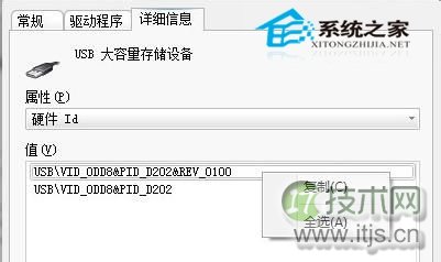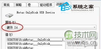 第二步. 双击U盘项进入属性页面,接下来打开【详细信息】面板,将其中的【属性】更改为【硬件ID】,然后复制下硬件ID中第一个值。