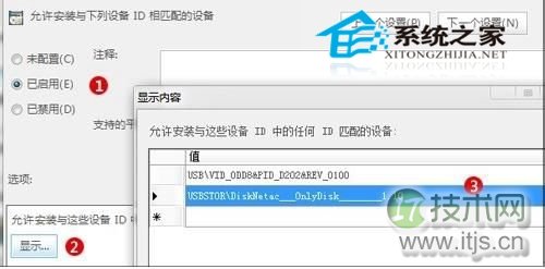 第六步. 分别开启【禁止安装未由其他策略设置描述的设备】和【允许安装与下列设备ID相匹配的设备】,并将刚才复制下来的U盘及USB大容量存储设备的b2b信息网硬件ID填写到【允许安装与下列设备ID相匹配的设备】的【显示】面板中。
