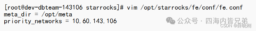 然后就编辑fe的配置文件。Fe是前台的意思。FE(Frontend)负责管理元数据、管理客户端连接、进行查询规划、查询调度等工作。每个 FE 节点都会在内存保留一份完整的元数据,这样每个 FE 节点都能够提供无差别的服务。