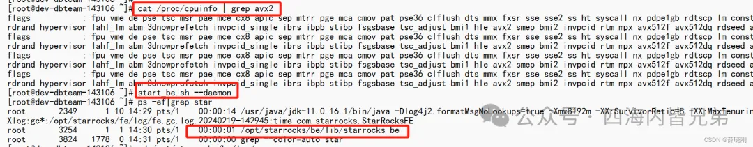 但是这里出问题了。后台进程启动失败,也没错误日志。传说的be.info日志没有。在反复确认配置没有问题后,只得找人咨询。恰好微信好友有一个原厂的朋友。问过后原厂产研的老师非常准确的说,是avx2的问题。没有 avx2 的话, be 肯定启动失败。