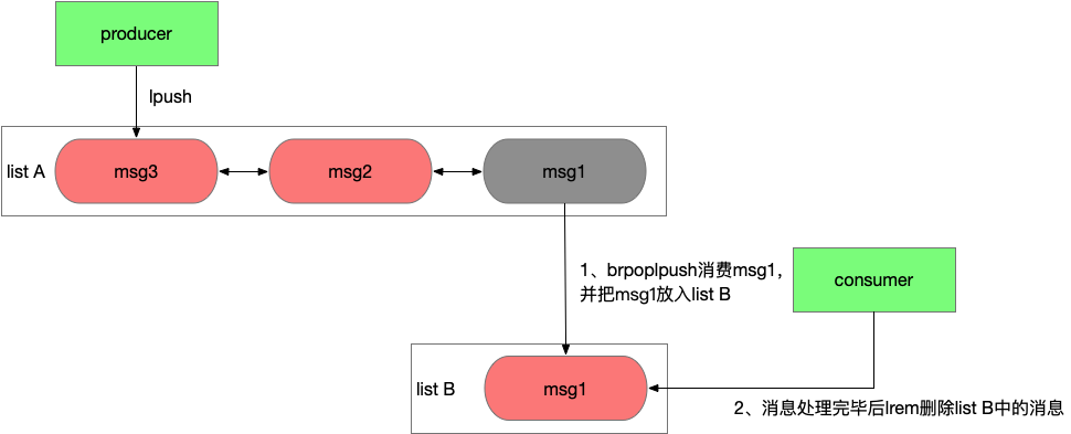 通过rpoplpush来联动2个list,可以做到消息先消费后确认,避免消费者应用异常情况下消息丢失
