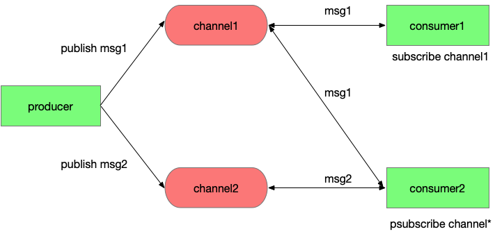 1) "pmessage"2) "channel*"3) "channel1"4) "msg1"1) "pmessage"2) "channel*"3) "channel2"4) "msg2"#生产者发布消息msg1和msg2