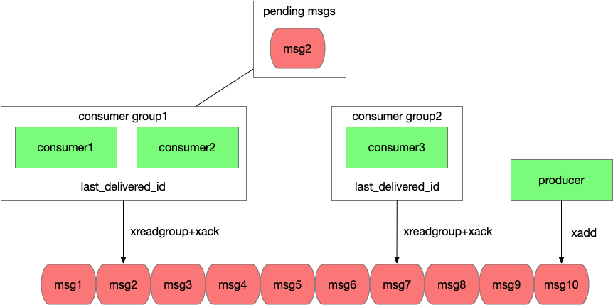 stream引入了消费者组的概念,一个消费者组内可以有多个消费者,同一个组内的消费者共享一个消息位点(last_delivered_id),这使得消费者能够水平的扩容,可以在一个组内加入多个消费者来线性的提升吞吐,对于一个消费者组,每条msg只会被其中一个消费者获取和处理,这是pubsub的广播模型不具备的。不同消费者组之前是相互隔离的,他们各自维护自己的位点,这使得一条msg能被多个不同的消费者组重复消费,做到了消息广播的能力。stream中消费者采用拉取的方式,并能设置timeout在没有消息时阻塞,通过这种长轮询机制保证了消息的实时性,而且消费速率是和消费者自身吞吐相匹配。消息不丢失: