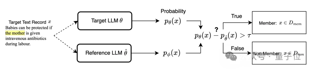 基于校正的成员推理攻击认为部分常用文本可能存在过度表征(Over-representative)的特征,即天然倾向于具有更高的概率被生成。因此该攻击范式使用了一种困难度校正(Difficulty Calibration)的方法,假设训练集文本会在目标模型上取得相较于校正模型更高的生成概率,通过比较目标大模型和校正大模型之间的生成概率差异来筛选出生成概率相对较高的文本。
