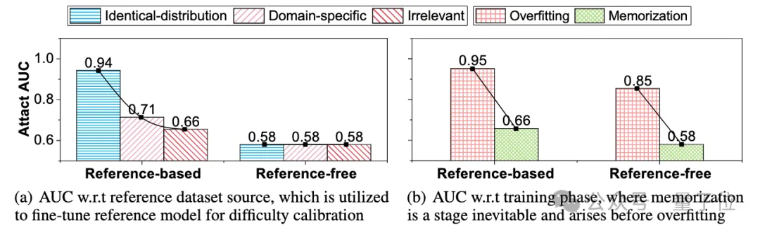 然而,现有的两种成员推理攻击范式依赖于两个在现实场景中无法成立的假设:1)可以获得与训练集具有相同数据分布的校正数据集,2)目标大型语言模型存在过拟合现象。 如下图 (a)所示,我们分别使用与目标模型训练集同分布、免费源码下载同领域、不相关的三个不同的校正数据集用于微调校正模型。 无校正的攻击性能始终较低,并且与数据集来源无关。对于基于校正的攻击,随着校正数据集与目标数据集之间相似性的下降,攻击性能呈现出灾难性地下降。如下图(b)所示,现有的两种攻击范式都仅能在呈现出过拟合现象的大模型中取得良好的攻击性能。因此,现有的范式在现实场景中只能取得接近于随机猜测的鉴别性能。
