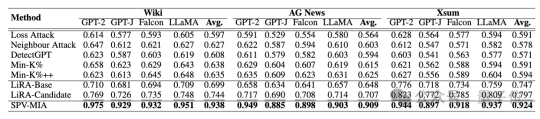 为了评估攻击算法SPV-MIA的有效性,本研究在四个开源的大模型GPT-2,GPT-J,Falcon-7B,LLaMA-7B和三个不同领域的微调数据集Wikitext-103, AG News, XSum上进行实验评估。