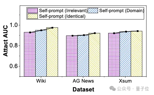 在现实世界中,攻击者可用的自提示文本来源通常受到实际部署环境的限制,有时甚至无法获取特定领域的文本。并且自提示文本的规模通常受限于 大模型 API 的访问频率上限和可用自提示文本的数量。为了进一步探究SPV-MIA在复杂的实际场景下的鲁棒性,本文从自提示文本来源,尺度,长度三个角度探究在极端情况下的成员推理攻击性能。