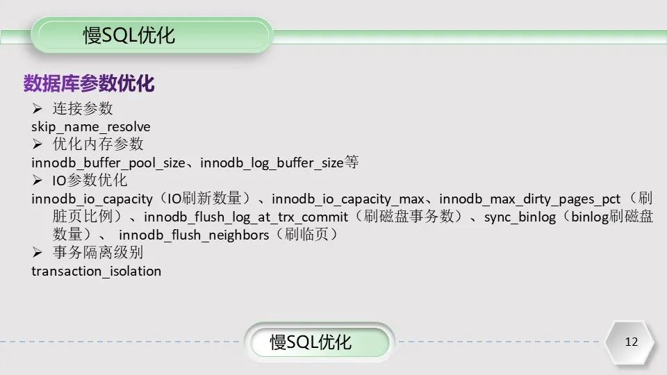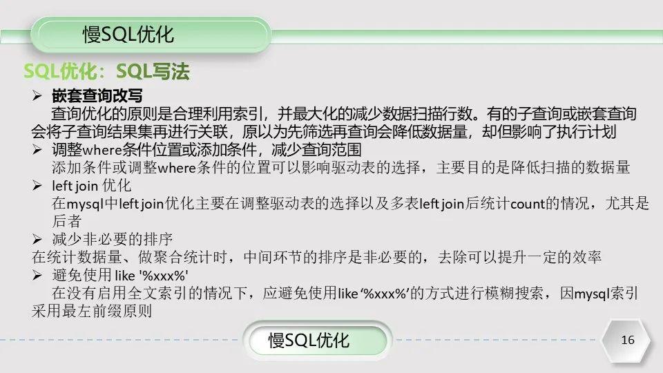 在慢SQL优化部分,库优通过硬件、网站模板化方操作系统、法都数据库参数、知道表优化、SQL改写优化等方面进行介绍,因硬件、操作系统参数及数据库参数方面的实战案例演示需要进行压测等方式进行,分享时未做准备,后续推文中我们将对此进行分享。SQL改写方面,PPT中列举了主要方法(没有介绍全,只针对出现频率非常高的情况进行介绍)。SQL案例因根据生产环境的亿华云真实例子进行演示,涉及业务,本文不分享,后续推文中将改写后逐一进行分享,小伙伴们不要着急。