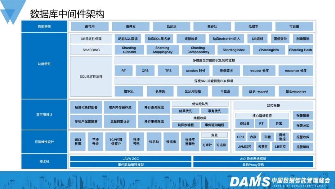 分集群部署,是解决不同业务对资源有不同侧重的问题;拥塞设计是非常重要的。假设一条SQL返回100个G的结果,如果没有合理的拥塞机制,轻易就能撑爆DBProxy的内存。所以必须有合理的拥塞机制,DBProxy要尽快把数据吐到客户端,要像TCP滑动窗口一样,根据客户端的数据接收能力,对数据流速作出调整;线程收敛是DBProxy性能保障的核心之一,一旦线程数过多,额外的内存和CPU开销就会增多。同时很多框架机制都是和线程数相关的,比如ZGC在线程数增多的时候,效果就会变差。4)功能特性比较多,我们挑几个来简单聊一聊: