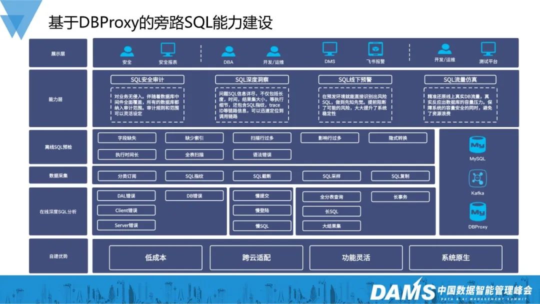 SQL安全审计:基于DBProxy的“SQL安全审计”能力,对业务没有侵入,随着DBProxy对业务的全面覆盖,所有的DB都自动纳入了审计范围。解决了推广覆盖难、接入成本高的问题。