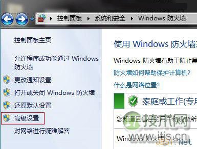 1.依次选择:开始→所有程序→管理工具→高级安全 Windows 防火墙。或者直接在Windows防火墙左侧选择高级设置。