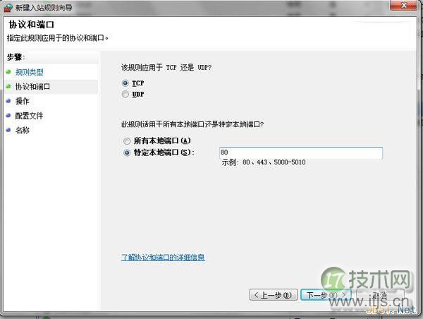 协议和端口:选中TCP以及特定本地端口,填入要开放的端口号(这里填入80)点下一步;