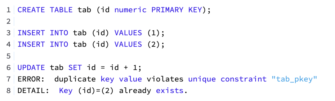 原因在于,PostgreSQL 默认在每行变化时检查约束(不同于SQL标准),而 Oracle 在语句结束时检查约束。 不过这个问题可以通过将约束创建为 DEFERRABLE 来解决,这样 PostgreSQL 会在语句结束时检查约束,并与 Oracle 的行为保持一致。