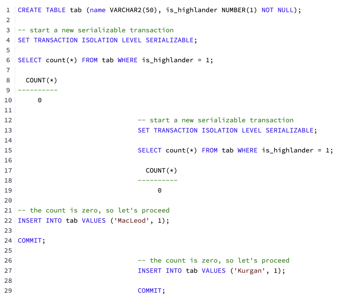 除了不准确,Oracle 的实现还存在许多问题。例如,如果您创建一个表时未指定 SEGMENT CREATION IMMEDIATE,然后在 SERIALIZABLE 事务中尝试插入第一行,就会遇到序列化错误。 虽然这在技术上是合法的,但如果在更高的隔离级别遇到问题时,Oracle 会经常抛出序列化错误。