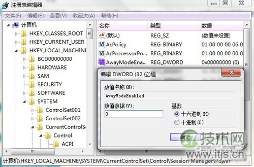 2依次打开注册表的统电HKEY_LOCAL_MACHINESYSTEMCurrentControlSetControlSession ManagerPower 找到“AwayModeEnabled”选项