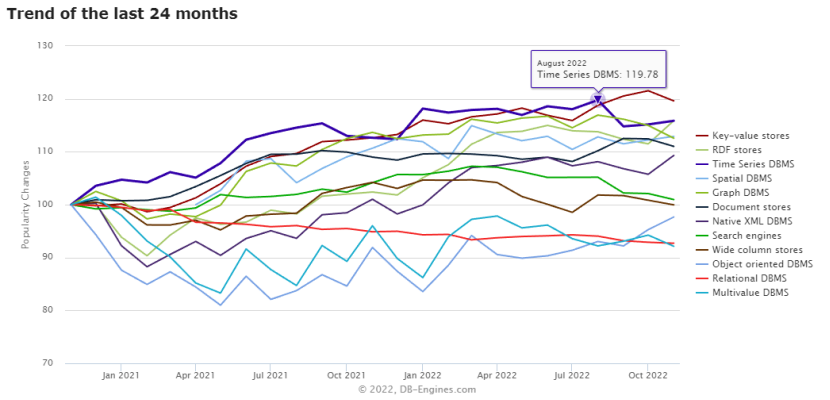 在DB-Engine排行榜上,我们可以看到时序数据库在近两年在DB-Engine上是关注度上升最快的数据库类型。