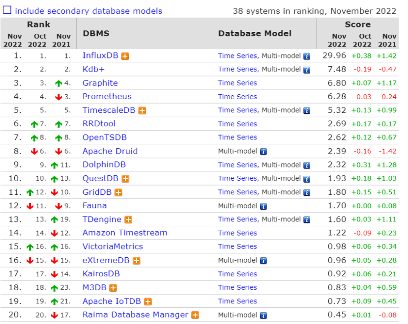图2时序数据库关注热度(数据来源:https://db-engines.com/en/ranking_categories)