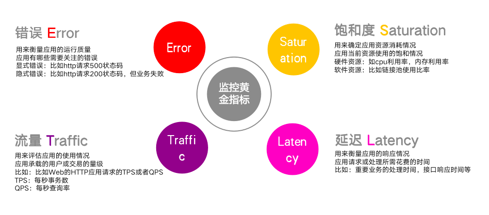 在监控指标选取方面,G行参考Google提出了黄金指标概念,具体内容如下图所示: