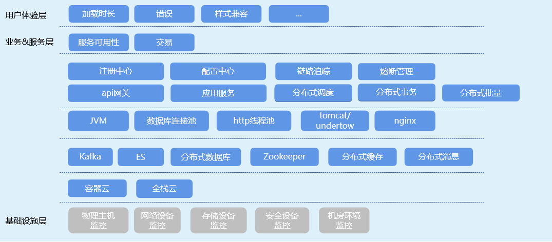 在传统的应用服务监控模型基础上,增加了微服务组件,如注册中心、配置中心、API网关等,增加了分布式应用组件,如分布式缓存、分布式批量、分布式消息、分布式数据库的监控标准化。