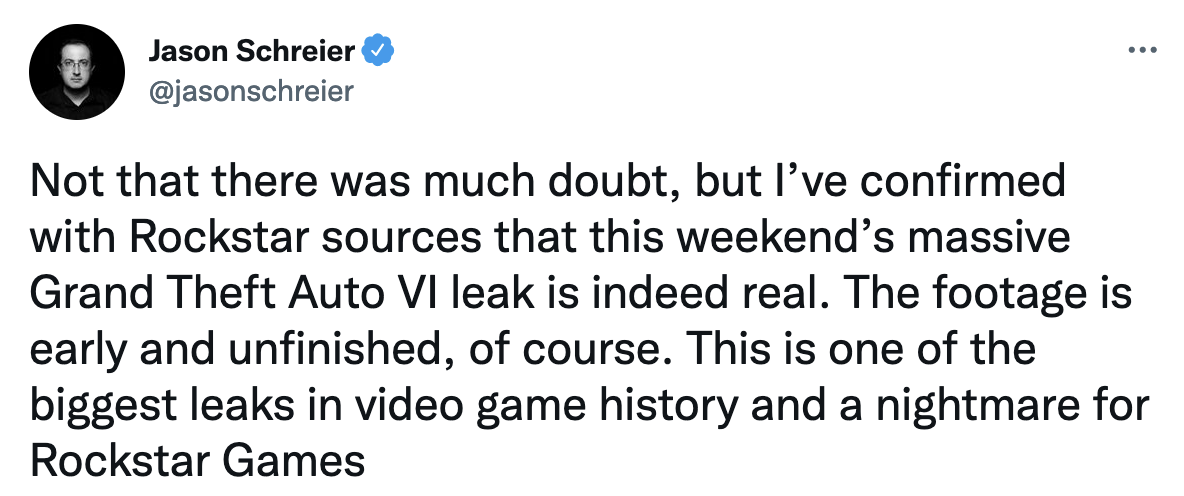 此事发生后,Rockstar 公司并没有第一时间发布声明,但游戏行业的知名人物 Jason Schreier 在个人社交媒体表示,在与 Rockstar 的消息来源交谈后,证实了此次泄漏是真实的。