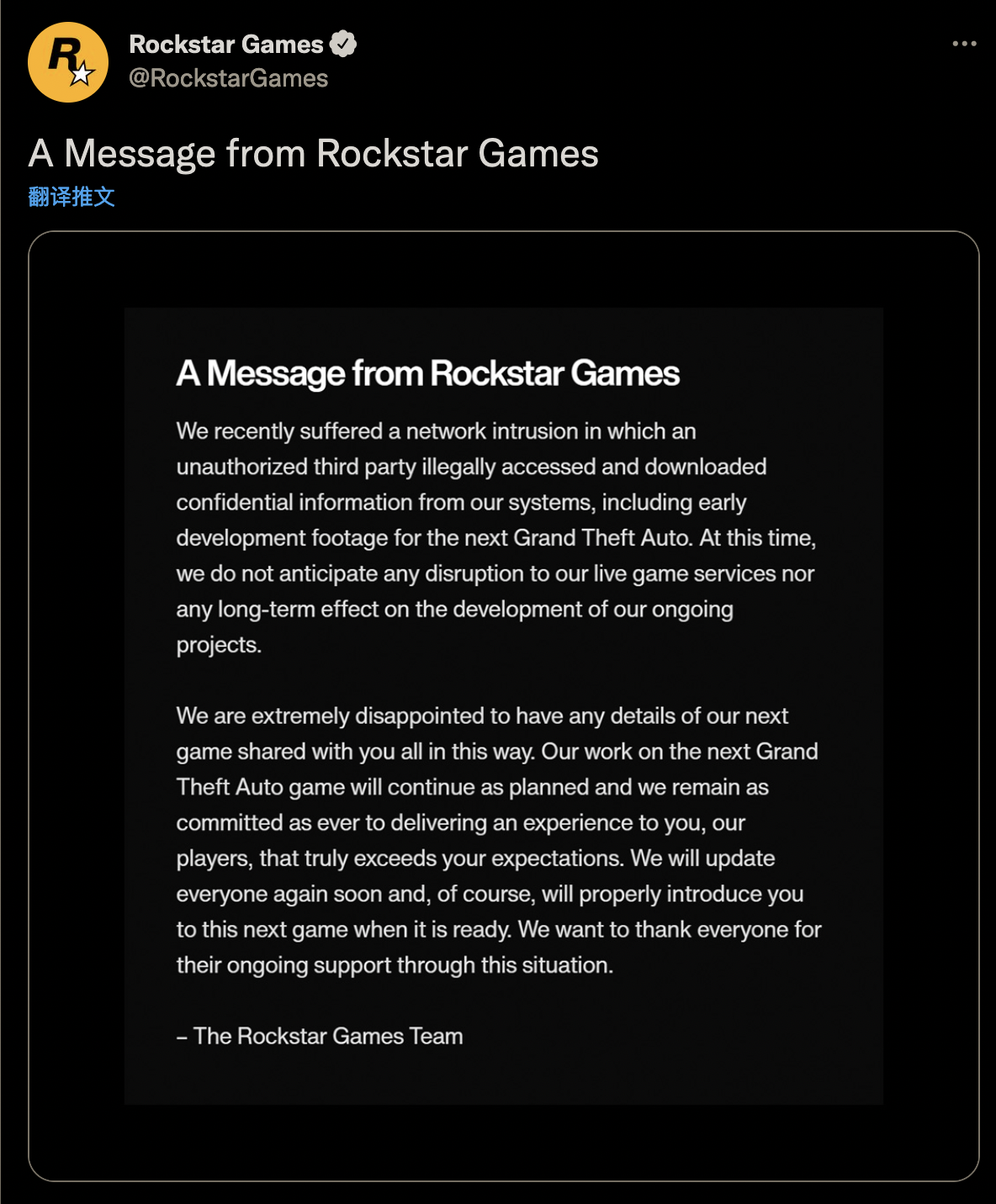 距离事件发生近两天后,Rockstar 于昨晚发出正式声明,确认遭遇网络入侵。