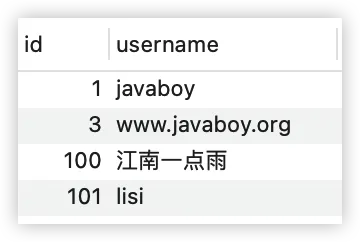 复制insert into user(id,username) values(1,javaboy),(null,江南一点雨),(3,www.javaboy.org),(null,lisi);1.插入完成之后,我们来看查询结果: